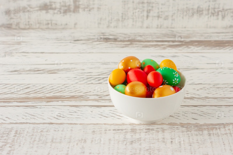 Красочные раскрашенные вручную пасхальные яйца в белой керамической миске на деревянном столе с копией пространства