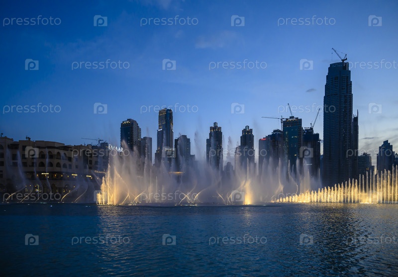 Огромный музыкальный фонтан в Дубае, ОАЭ. Вечером 13 марта 2020 г