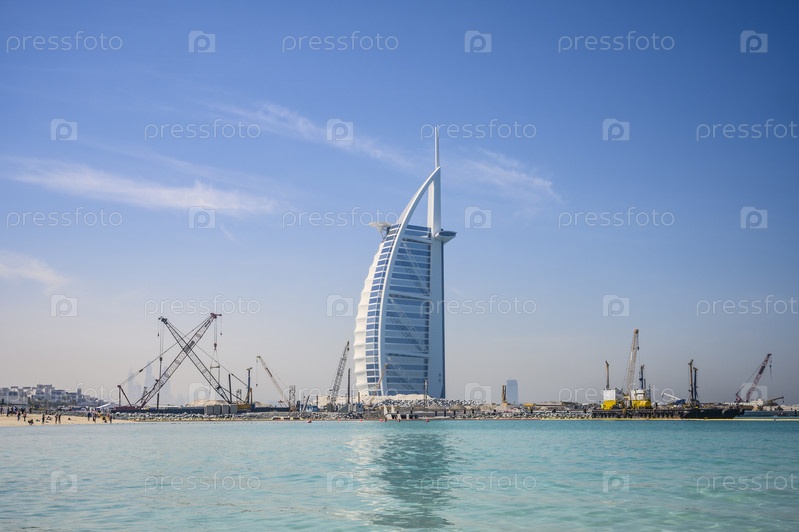Отель Burj al Arab окружен строительной площадкой на фоне голубого неба, моря и пляжа в Дубае, Объединенные Арабские Эмираты.Ясный солнечный день 13 марта 2020 г