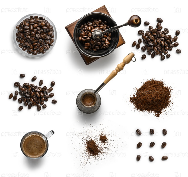 Кофе и аксессуары вид сверху на белом фоне