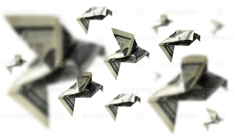 Стодолларовые купюры в виде птиц в полете на белом фоне