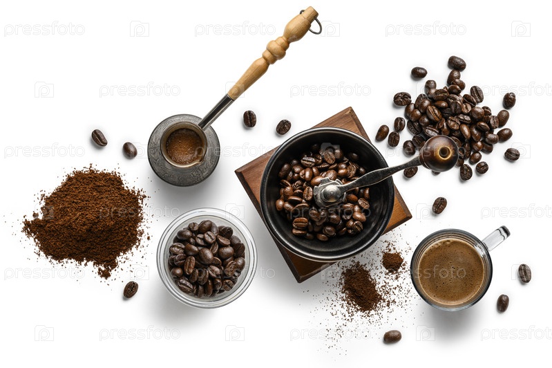Кофе и аксессуары вид сверху на белом фоне