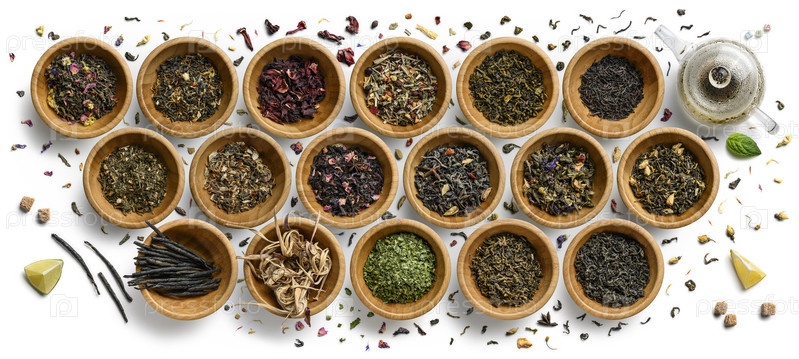 Большой ассортимент чая на белом фоне. Вид сверху