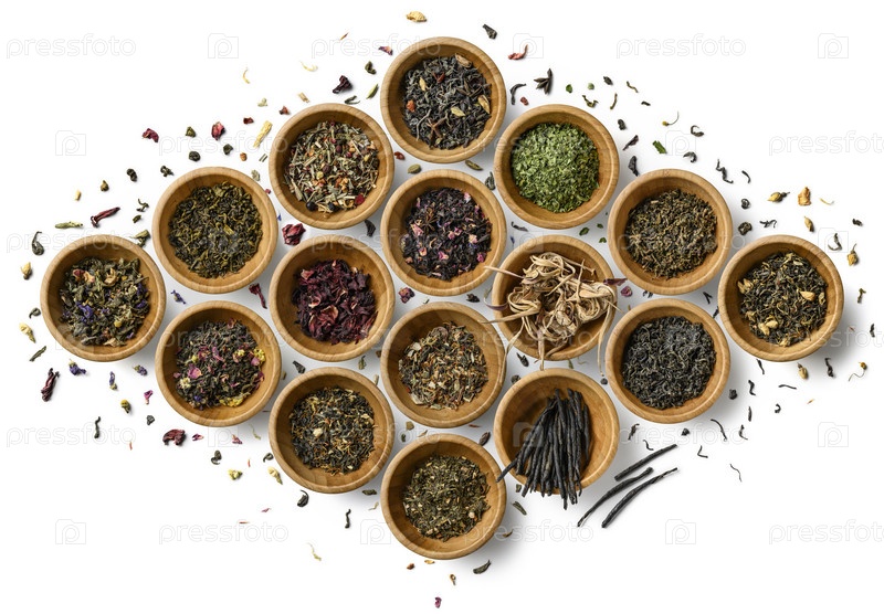 Большой ассортимент чая на белом фоне. Вид сверху
