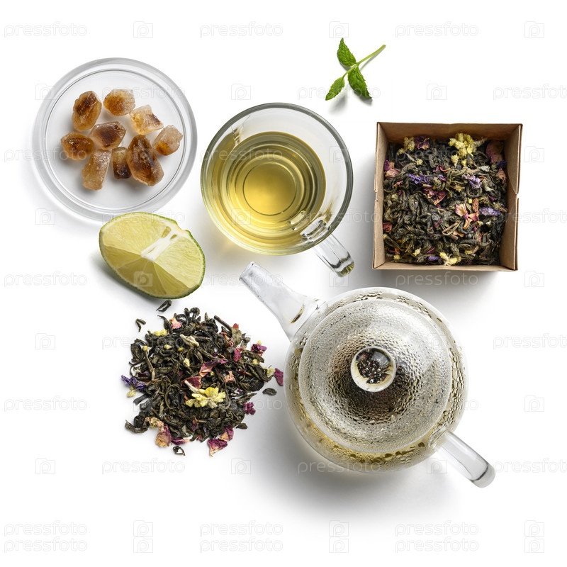 Зеленый чай с натуральными ароматическими добавками и аксессуарами. Вид сверху на белом фоне