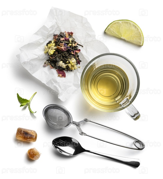 Зеленый чай с натуральными ароматическими добавками и аксессуарами. Вид сверху на белом фоне