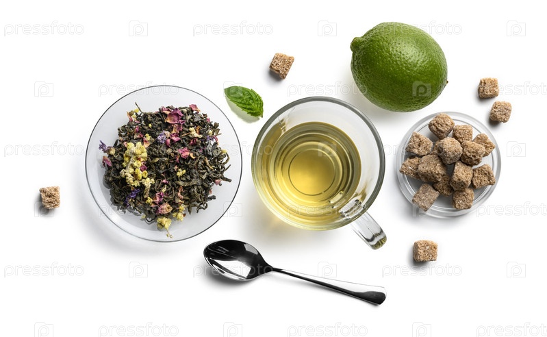 Зеленый чай с натуральными ароматическими добавками и аксессуарами. Вид сверху на белом фоне