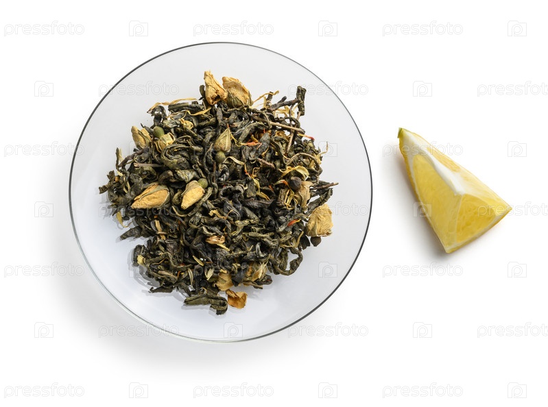Зеленый чай с натуральными ароматическими добавками. Вид сверху на белом фоне