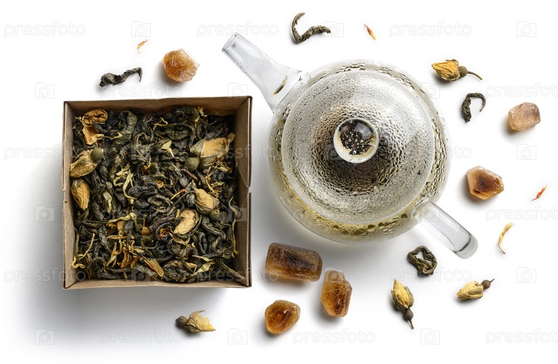 Зеленый чай с натуральными ароматизаторами и чайник. Вид сверху на белом фоне