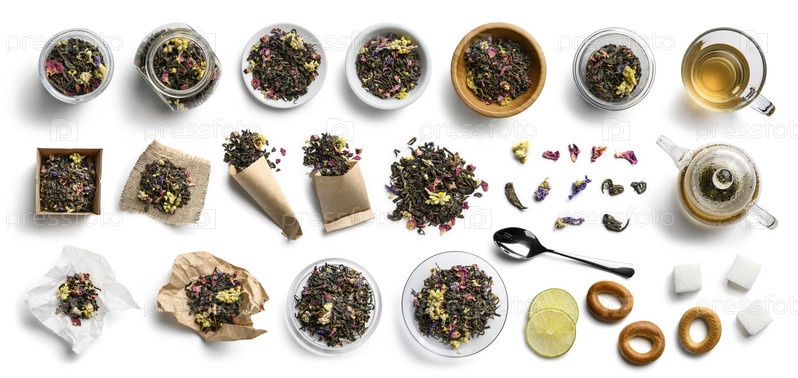 Зеленый чай и аксессуары вид сверху на белом фоне