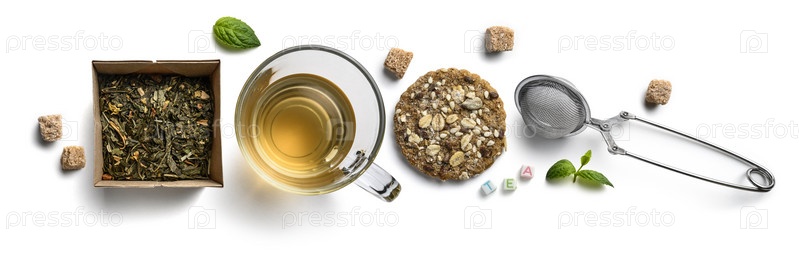Зеленый чай с натуральными ароматическими добавками и аксессуарами. Вид сверху на белом фоне