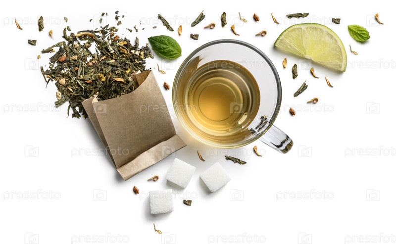 Зеленый чай с натуральными ароматическими добавками и чашка. Вид сверху на белом фоне
