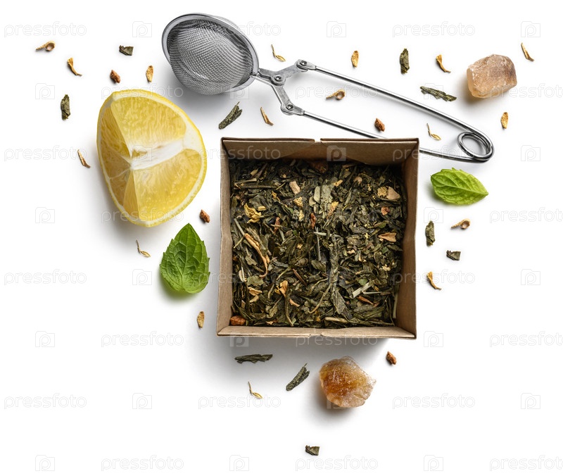 Зеленый чай с натуральными ароматическими добавками. Вид сверху на белом фоне