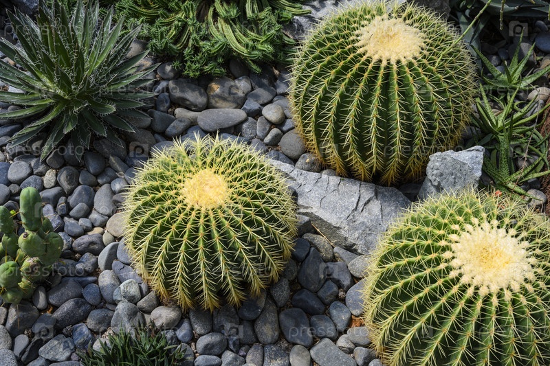 Зеленый колючий кактус вид сверху на фоне камней