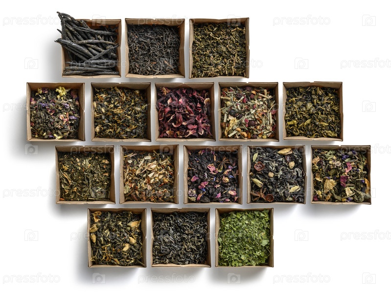 Большой ассортимент чая на белом фоне. Вид сверху
