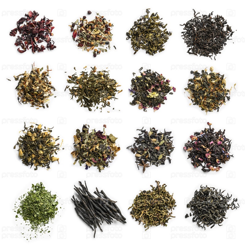 Большой ассортимент чая на белом фоне. Вид сверху