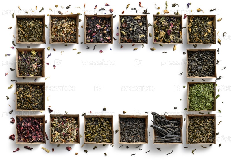 Большой ассортимент чаев в виде рамки на белом фоне. Вид сверху