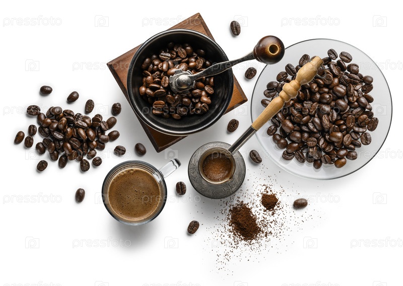 Кофе и аксессуары вид сверху на белом фоне