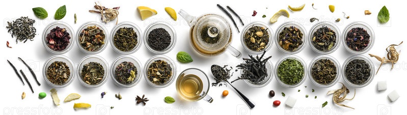 Большой ассортимент чая на белом фоне. Вид сверху