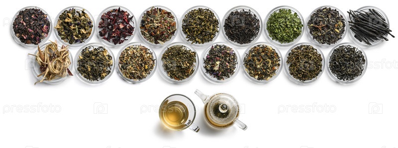 Большой ассортимент чая на белом фоне. Вид сверху