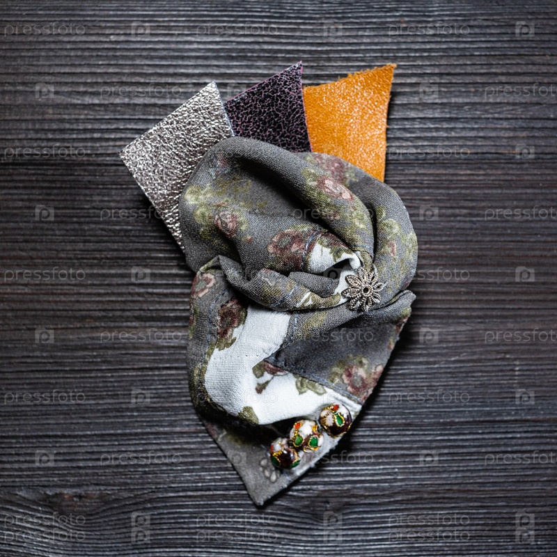 Вид сверху на брошь из шелка и кожи с перегородчатой перегородкой