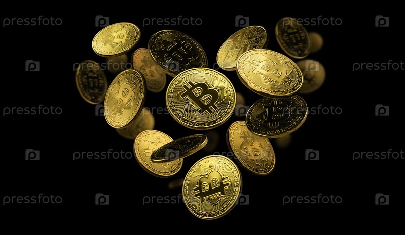 Биткойн-монеты в форме сердца на черном фоне