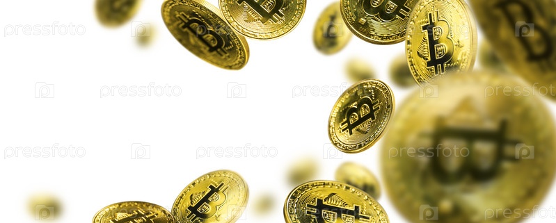 Золотая монета Биткойн левитирует на белом фоне
