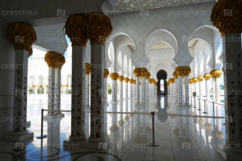 Большая мечеть шейха Заида бин Султана Аль Нахайяна, Абу-Даби, Объединенные Арабские Эмираты. Ясный солнечный день, 12 марта 2020 г