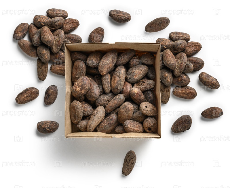 Какао-бобы на белом фоне. Вид сверху