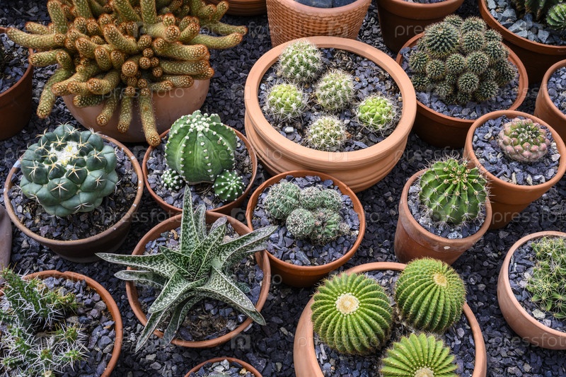 Группа кактусов в коричневых горшках