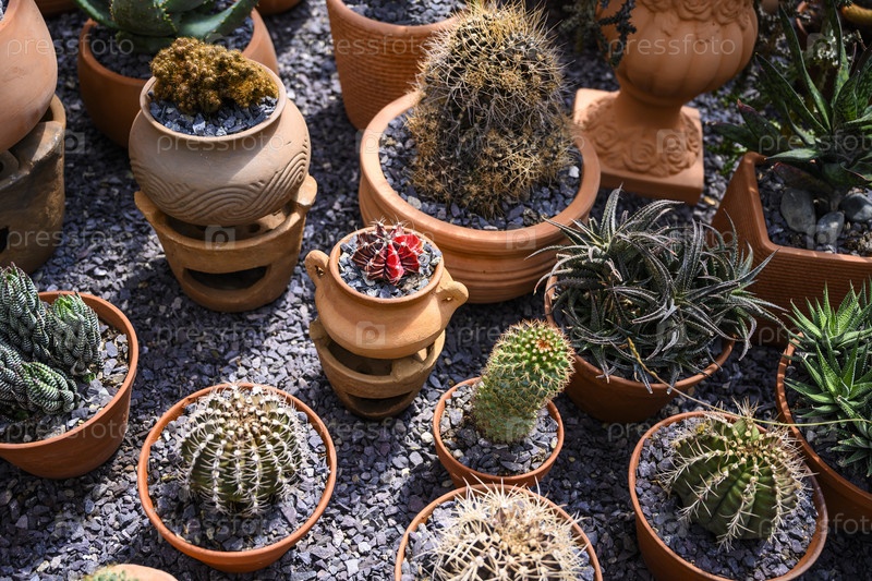 Группа кактусов в коричневых горшках
