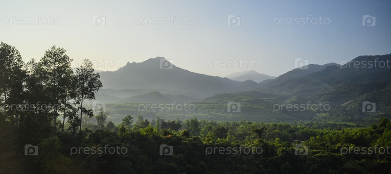 Вид на горы и леса утром в тумане во Вьетнаме