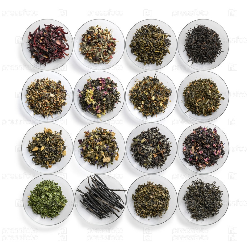 Большой ассортимент чая на белом фоне. Вид сверху