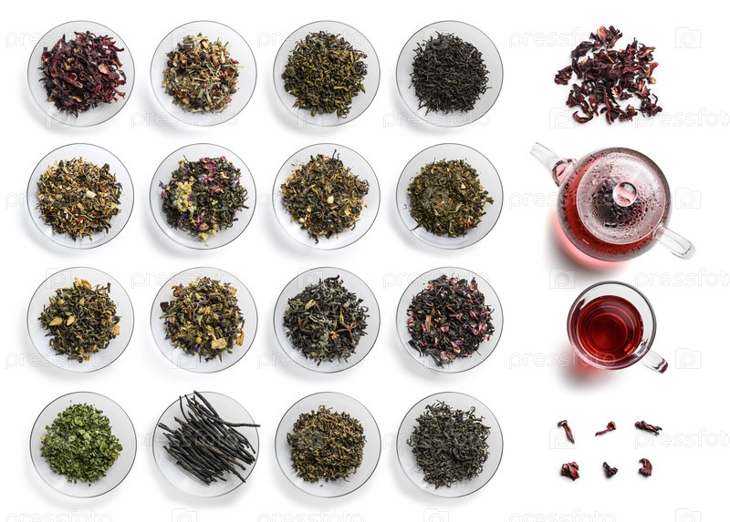 Большой ассортимент чая на белом фоне. Вид сверху