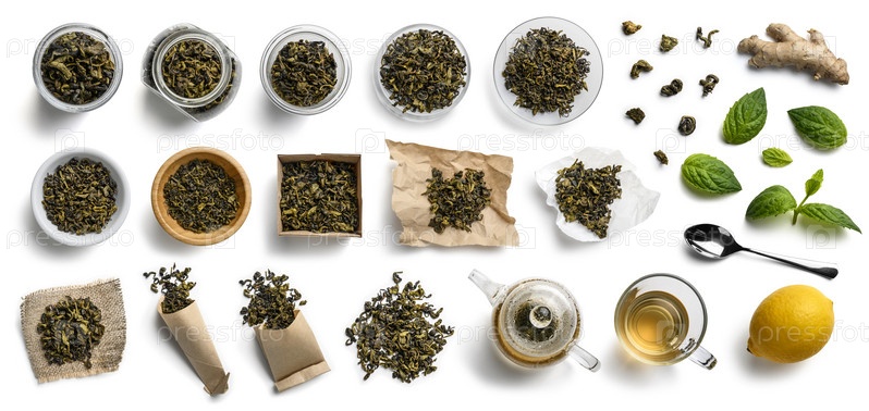Зеленый чай и аксессуары вид сверху на белом фоне