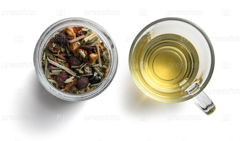 Зеленый чай с натуральными ароматическими добавками и чашка чая. Вид сверху на белом фоне