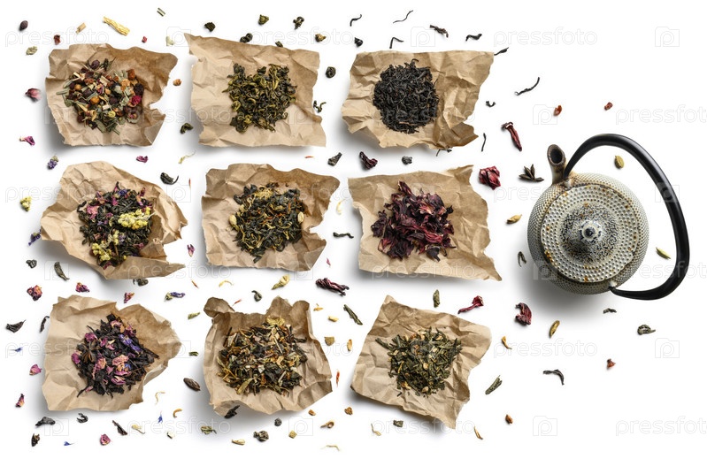 Большой ассортимент чая на белом фоне. Вид сверху
