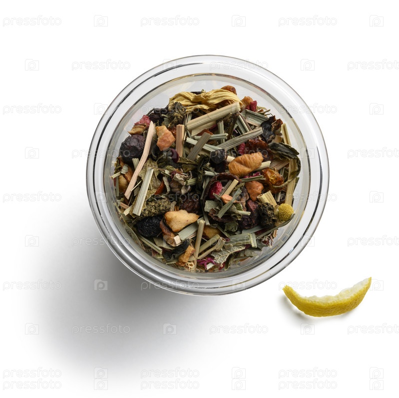 Зеленый чай с натуральными ароматическими добавками. Вид сверху на белом фоне