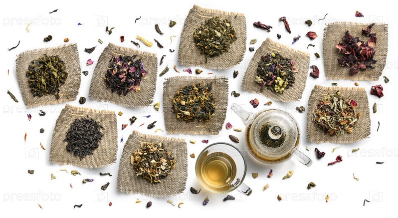 Большой ассортимент чая на белом фоне. Вид сверху
