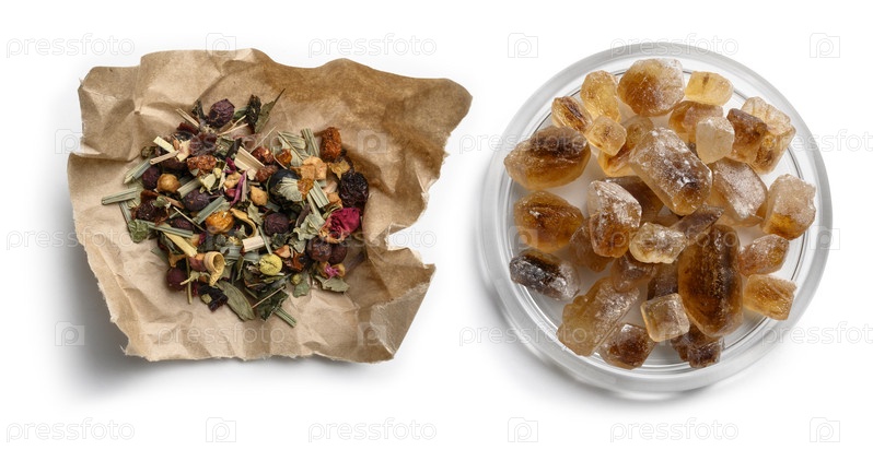 Зеленый чай с натуральными ароматическими добавками и карамельным сахаром. Вид сверху на белом фоне