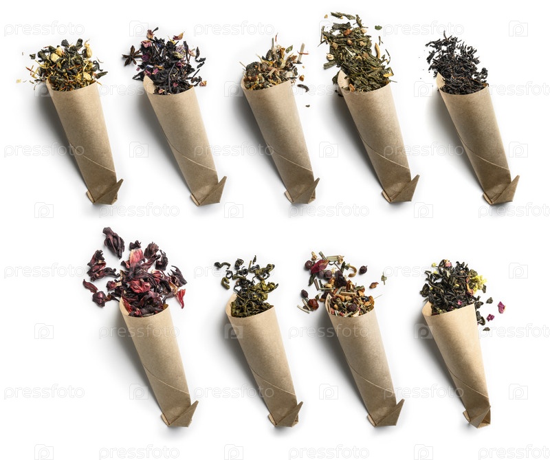 Большой ассортимент чая на белом фоне. Вид сверху