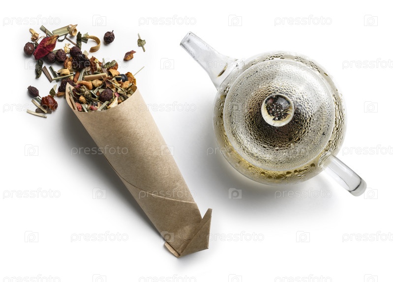 Зеленый чай с натуральными ароматическими добавками и заварочный чайник. Вид сверху на белом фоне