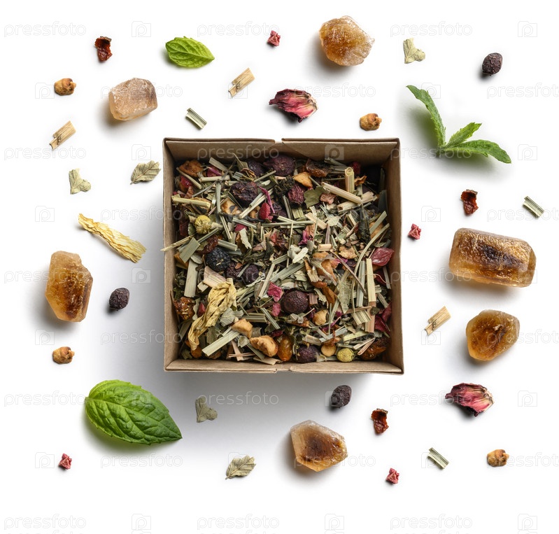 Травяной чай, мята и карамельный сахар на белом фоне. Вид сверху