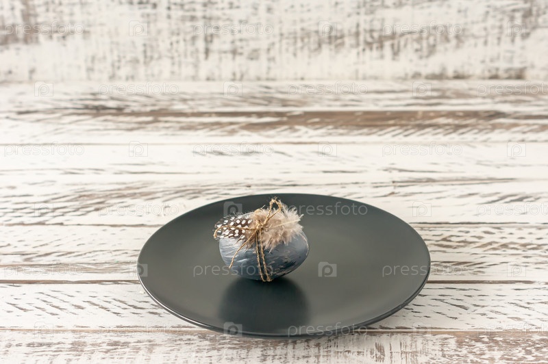 Модные цветные пасхальные яйца темных цветов и перья на тарелке на деревянном столе. Подготовка к пасхальным праздникам. Праздничная композиция