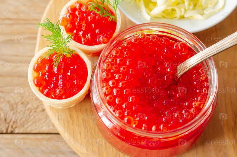 Тарталетки со сливочным маслом и красной икрой. Изысканная еда, закуски. Гастроном. Морепродукты