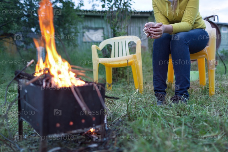 Женщина с чаем у костра во дворе