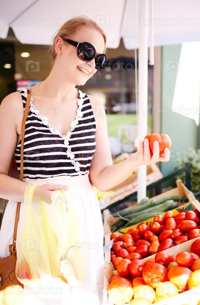 Молодая женщина покупает свежие помидоры