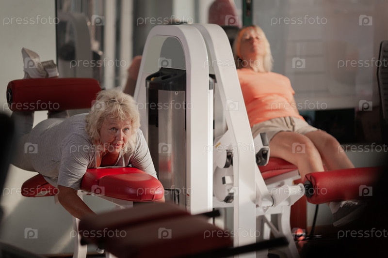 Две женщины средних лет тренируются в тренажерном зале