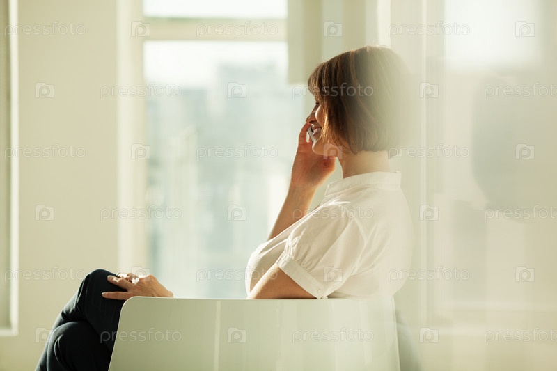 Вид сбоку улыбающейся деловой женщины, разговаривающей по телефону