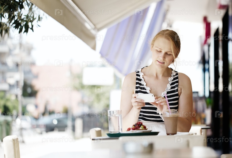 Привлекательная женщина фотографирует выпечку на свой мобильный
